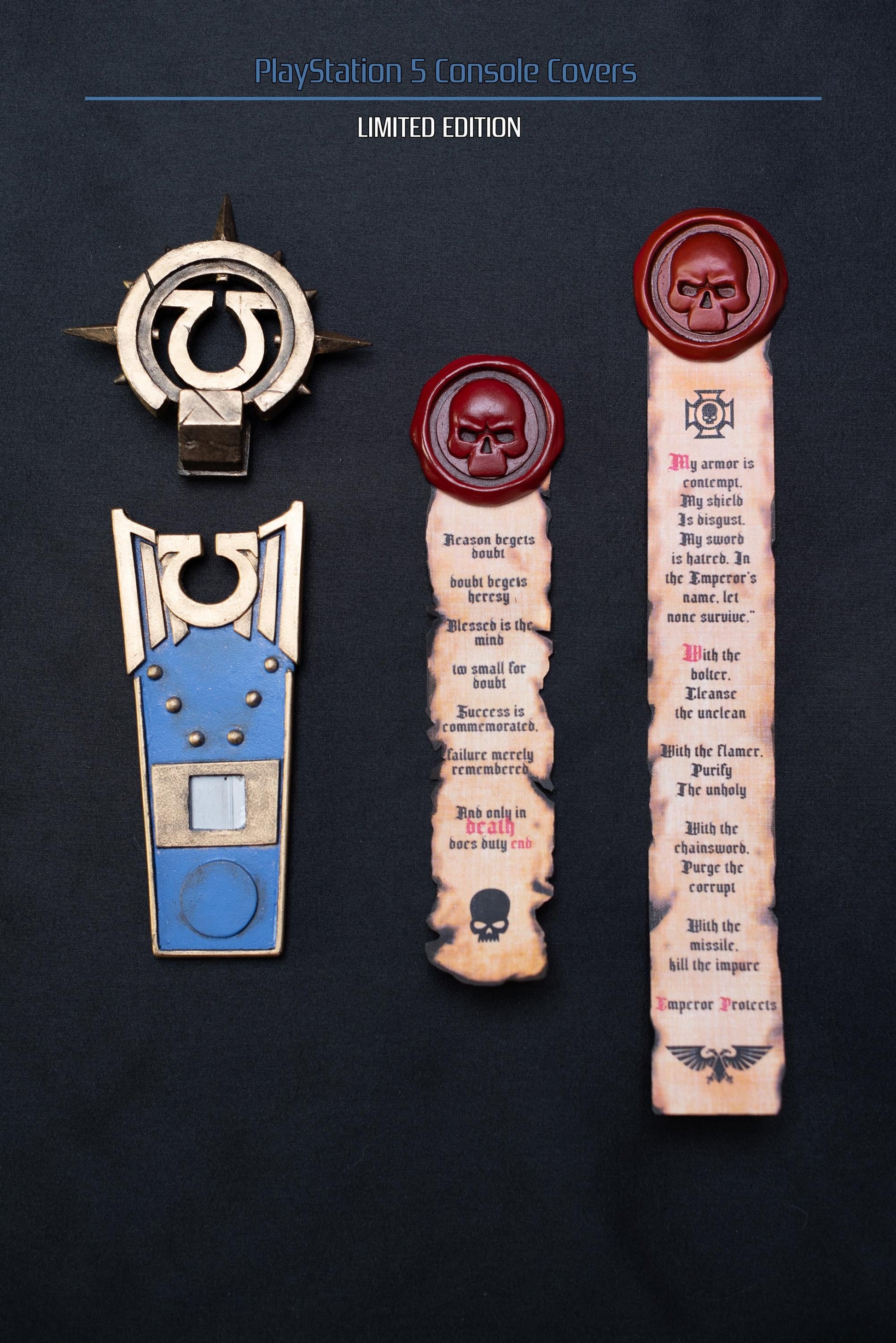 Custom made Warhammer 40,000 Space Marine 2 style PlayStation 5 slim console covers.