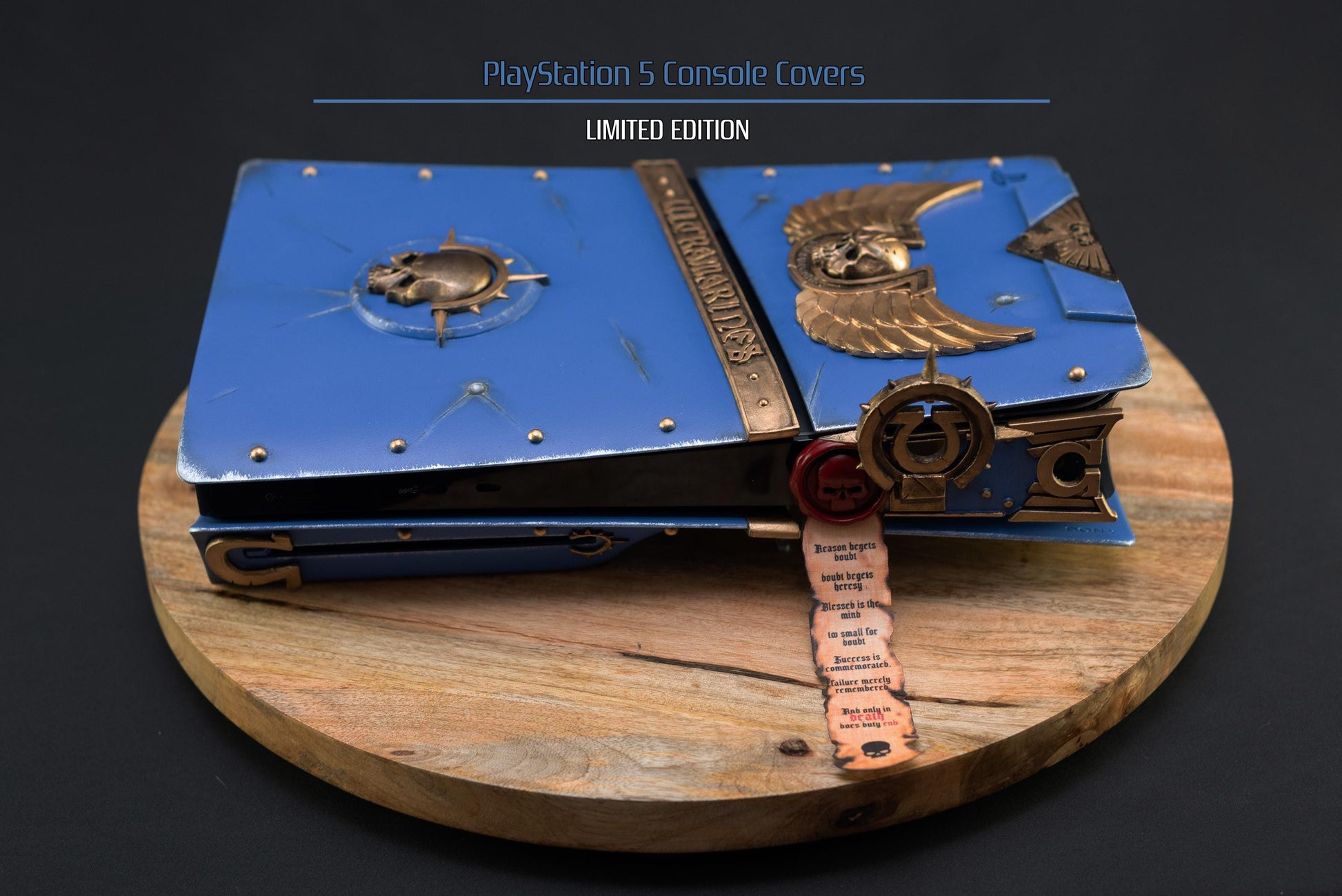 Custom made Warhammer 40,000 Space Marine 2 Ultramarine style PlayStation 5 slim console covers.